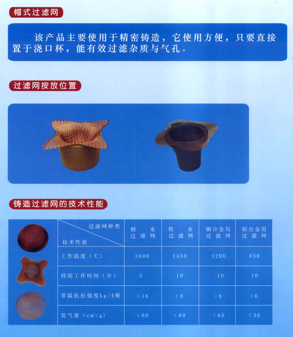 常州市猛將過(guò)濾網(wǎng)有限公司是專業(yè)生產(chǎn)系列鑄造過(guò)濾網(wǎng)的廠家。主要產(chǎn)品有:鐵水過(guò)濾網(wǎng)、鋼水過(guò)濾網(wǎng)、銅水過(guò)濾網(wǎng)、鋁水過(guò)濾網(wǎng)及熔模用帽式過(guò)濾網(wǎng)等。本廠產(chǎn)品是哈工大科研成果,榮獲國(guó)家經(jīng)委頒發(fā)的新技術(shù)成果獎(jiǎng)。航天部科技進(jìn)步一等獎(jiǎng);中國(guó)質(zhì)量檢驗(yàn)協(xié)會(huì)授予“猛將”牌高硅氧過(guò)濾網(wǎng)“國(guó)家權(quán)威檢測(cè)達(dá)標(biāo)產(chǎn)品”榮譽(yù)證書(shū);我廠生產(chǎn)的“四角帽式過(guò)濾網(wǎng)”獲國(guó)家專利局外觀設(shè)計(jì)專利證書(shū);并獲香港國(guó)際新技術(shù)新產(chǎn)品博覽會(huì)“金獎(jiǎng)證書(shū)”。2002年獲亞洲國(guó)際新技術(shù)新產(chǎn)品博覽會(huì)“科技發(fā)明進(jìn)步獎(jiǎng)”,2002年本廠所生產(chǎn)的“四角帽式過(guò)濾網(wǎng)在首屆“金艦杯”國(guó)際新技術(shù)成果網(wǎng)絡(luò)交易會(huì)活動(dòng)中成績(jī)顯著,被評(píng)為金杯獎(jiǎng)。同年在日內(nèi)瓦國(guó)際專利技術(shù)成果博覽會(huì)中被評(píng)為國(guó)際優(yōu)秀專利金獎(jiǎng)。目前,本廠產(chǎn)品銷往全國(guó)各省、市、自治區(qū),是國(guó)內(nèi)銷量最大的廠家之一。同時(shí)出口韓國(guó)、泰國(guó)、東南亞等國(guó)家。進(jìn)入21世紀(jì)以來(lái),我國(guó)加入WTO后,我廠在哈工大葉榮茂教授的指導(dǎo)下,開(kāi)發(fā)研制出一種多孔泡沫陶瓷過(guò)濾網(wǎng),該產(chǎn)品兼具玻璃纖維過(guò)濾網(wǎng)和直孔過(guò)濾網(wǎng)的篩分夾渣功能,且更具有吸附微小夾渣氧化物的功能。多孔泡沫陶瓷過(guò)濾網(wǎng)的主要工作原理是讓紊亂、翻騰的(TV urbuItnt Flow)金屬液經(jīng)過(guò)產(chǎn)品形成平穩(wěn)、均勻(SmoothFlow)的金屬液,金屬液經(jīng)過(guò)復(fù)雜的多孔泡沫陶瓷過(guò)濾網(wǎng),能有效地吸附截留微小氧化夾渣物,并溢除氣泡,然后能使鑄件產(chǎn)品達(dá)到純潔度高、強(qiáng)度高、韌性好、機(jī)械加工性能好等特點(diǎn),從而能夠降低生產(chǎn)成本,提高產(chǎn)品成品率,增加經(jīng)濟(jì)效益。我廠熱忱歡迎廣大用戶使用該產(chǎn)品。 我公司設(shè)計(jì)發(fā)明的“四角帽式過(guò)濾網(wǎng)”,已在2001年3月申請(qǐng)專利,并于當(dāng)年11月底經(jīng)中華人民共和國(guó)知識(shí)產(chǎn)權(quán)局授權(quán)公告。頒布了外觀設(shè)計(jì)專利證書(shū),證書(shū)號(hào)第207620號(hào),F(xiàn)有個(gè)別廠家悍然侵權(quán),公然在有關(guān)鑄造媒體打出侵權(quán)產(chǎn)品廣告。對(duì)此,我們鄭重聲明,要求侵權(quán)廠家盡快采取糾正措施,為了維護(hù)我們的知識(shí)產(chǎn)權(quán),我們不排除采取法律行動(dòng)的可能。