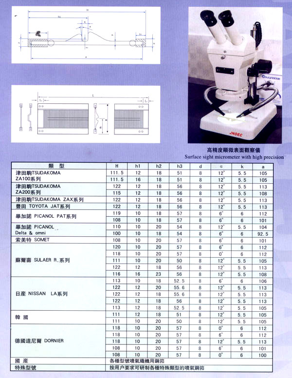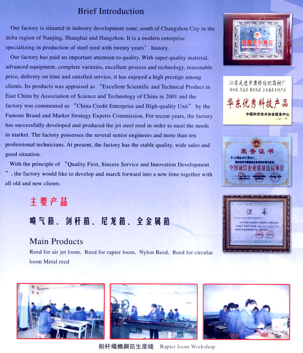 漕橋紡織器材廠位于常州市南郊寧、滬、杭金三角漕橋工業(yè)開發(fā)區(qū),是全國專業(yè)生產(chǎn)鋼筘規(guī)模較大的現(xiàn)代化廠家,已具有20年的歷史。 本廠生產(chǎn)的鋼筘有噴氣、劍桿筘、尼龍?bào)、圓織機(jī)筘和金屬筘分鉸筘、織帶筘、無梭織帶筘……本廠特別擅長生產(chǎn)高密度的劍桿筘。 本廠素以質(zhì)量為重,均采用優(yōu)質(zhì)材料制筘,如噴氣筘使用的筘片膠水鋁架等,均采用日本進(jìn)口的材料;劍桿筘筘片采用日本進(jìn)口的57B線材,膠水均采用紡織部定點(diǎn)的陜西紡織研究所生產(chǎn)的優(yōu)質(zhì)膠水、高密度劍桿筘均用進(jìn)口膠水制筘;全金屬筘均用云南的優(yōu)質(zhì)錫制筘。 各種鋼筘筘面的平整度,筘齒的均勻度、垂直度,筘片的彈性度,膠水的牢固度廣大用戶使用后感到滿意放心,特別是使用壽命特別長,受到用戶一致的盛贊,真是料好筘好,筘好布好。 本廠為了使質(zhì)量精益求精,增添了不少先進(jìn)設(shè)備,并聘請了數(shù)名高級工程師和十多位具有專業(yè)知識的技術(shù)人員把關(guān)。由于質(zhì)量穩(wěn)定可靠,2001年被中國科學(xué)技術(shù)協(xié)會(huì)評為“華東優(yōu)秀科技產(chǎn)品”二00二年被中國管理科學(xué)研究院名牌與市場戰(zhàn)略專家委員會(huì)評為“中國誠信企業(yè)質(zhì)量達(dá)標(biāo)單位”。 今本廠產(chǎn)品暢銷全國20多個(gè)省市,價(jià)格優(yōu)惠,供不應(yīng)求,形勢喜人。 本廠本著“以質(zhì)取勝、誠信服務(wù)、創(chuàng)新發(fā)展”的宗旨,愿與廣大新老客戶攜手共肩,昂首走進(jìn)新時(shí)代,迎接新的挑戰(zhàn)。