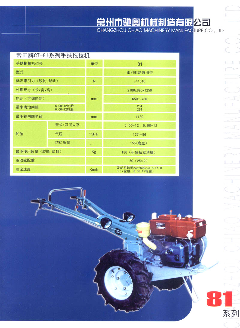 常州市馳奧機(jī)械制造有限公司是生產(chǎn)手扶拖拉機(jī)的專(zhuān)業(yè)生產(chǎn)企業(yè),公司位于風(fēng)景秀麗、人文薈萃的江蘇省常州市,緊鄰滬寧、寧常高速以及312國(guó)道,交通極為便利。公司擁有先進(jìn)的手扶拖拉機(jī)生產(chǎn)線(xiàn),主要生產(chǎn)81/91,121/151型手扶拖拉機(jī),產(chǎn)品均為國(guó)家農(nóng)機(jī)購(gòu)置補(bǔ)貼產(chǎn)品。 公司堅(jiān)持以科技興企業(yè),在提高產(chǎn)品技術(shù)含量的同時(shí),加強(qiáng)產(chǎn)品質(zhì)量、售后服務(wù)方面的監(jiān)督與管理,根據(jù)市場(chǎng)需求提升改進(jìn)和研發(fā)新產(chǎn)品,使公司產(chǎn)品得到了市場(chǎng)的認(rèn)可,贏得了廣大農(nóng)民用戶(hù)的一致好評(píng)。 公司將本著“誠(chéng)信經(jīng)營(yíng)、質(zhì)量第一、客戶(hù)至上”的經(jīng)營(yíng)理念,立足現(xiàn)在、著眼未來(lái),以打造常州一流的農(nóng)機(jī)品牌為目標(biāo),在提升產(chǎn)品技術(shù)、保障產(chǎn)品質(zhì)量的同時(shí),不斷研發(fā)新產(chǎn)品,最大程度的滿(mǎn)足用戶(hù)需求,為我國(guó)農(nóng)業(yè)機(jī)械現(xiàn)代化發(fā)展做出應(yīng)有的貢獻(xiàn)!