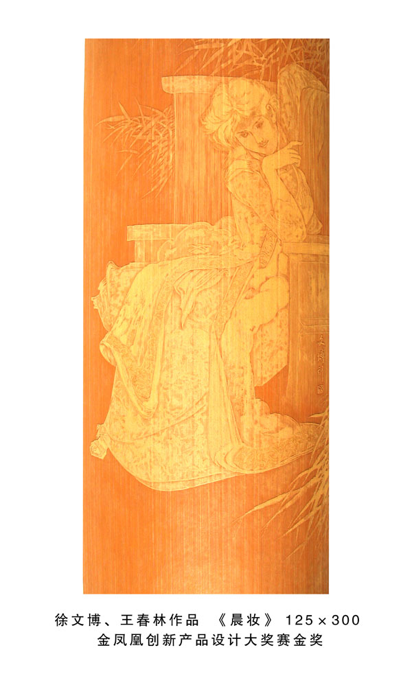 得獎情況 1、扇形擺件《花鳥》2004年9月太湖博覽會金獎 2、《蘭亭序》2008年11月江蘇藝博杯工藝美術精品獎銀獎 3、《雄風圖》2008年11月江蘇藝博杯工藝美術精品獎創(chuàng)意獎 4、《靜音》2008年11月“天工藝苑•百花杯”中國工藝美術精品獎銀獎 5、《人物》2008年12月中國收藏藝術精品博覽會金獎 6、《花鳥》200 8年12月中國收藏藝術精品博覽會銀獎 7、《青竹鳥語》2008年12月中國收藏藝術品博覽會“入圍收藏品” 8、《吉祥富貴》2009年3月“金鳳凰”創(chuàng)新產(chǎn)品設計大獎賽金獎 9、《黃山云!2009年10月江蘇藝博杯工藝美術精品獎金獎 10、《花鳥》2009年10月第二屆江蘇旅游商品博覽會最佳產(chǎn)品獎 11、《秋菊圖》2009年11月“天工藝苑•百花杯”中國工藝美術精品獎銀獎 12、《秋鷹圖》2010年3月“金鳳凰”創(chuàng)新產(chǎn)品設計大獎賽優(yōu)秀獎 13、《花鳥四屏》2010年3月“金鳳凰”創(chuàng)新產(chǎn)品設計大獎賽銅獎 14、《荷塘清暑》2010年5月深圳國際文化產(chǎn)業(yè)博覽交易會銅獎 15、《溪山煙云圖》2010年9月江蘇藝博杯工藝美術精品大獎賽金獎 16、《高士臨風圖》2010年10月“天工藝苑•百花杯”中國工藝美術精品獎銀獎 17、《溪山煙云圖》2010年11月第二屆東方工藝美術之都博覽會“迎春花獎” 18、《深山尋隱圖》2011年3月“金鳳凰”產(chǎn)品設計大獎賽銅獎 19、《欣欣向榮》2011年5月深圳國際文化產(chǎn)業(yè)博覽交易會金獎 20、《江崖遠眺圖》2011年9月江蘇藝博杯工藝美術精品大獎賽金獎 21、《富春山居圖》2011年10月“天工藝苑•百花杯”中國工藝美術精品獎金獎 22、《深山訪友》2011年11月中國無錫國際文化藝術博覽會銀獎 23、《幽谷清音》2012年3月“金鳳凰”創(chuàng)新產(chǎn)品設計大獎賽銅獎 24、《群芳競艷》2012年10月“儒仕儒家、百花杯”中國工藝美術精品博覽會金獎 25、《山村渡口圖》2012年12江蘇藝博杯工藝美術精品大獎賽金獎。 26、《晨妝》2013年4月“金鳳凰”創(chuàng)新產(chǎn)品設計大獎賽金獎。 27、《和風圖》2013年6月中國(青島)工藝美術博覽會創(chuàng)新產(chǎn)品設計大賽金獎。 28、《松壑聽泉》2013年9月江蘇藝博杯工藝美術精品大獎賽銀獎。 29、《君子圖》2013年11月“國信•百花杯”中國工藝美術精品獎銀獎 30《碧水輕舟》2014年5月深圳國際文化產(chǎn)業(yè)博覽交易會銀獎。 31、《千巖萬壑圖》2014年10月“中國原創(chuàng)•百花杯”中國工藝美術精品獎金獎 32、《溪山訪友圖》2014年10月江蘇藝博杯工藝美術精品大獎賽銀獎 33、《深山云壑》2014年12月深圳冬季國際文化產(chǎn)業(yè)博覽交易會金獎 34、《鷹》2015年深圳文化產(chǎn)業(yè)博覽交易會獲“中國工藝美術文化創(chuàng)意獎”金獎