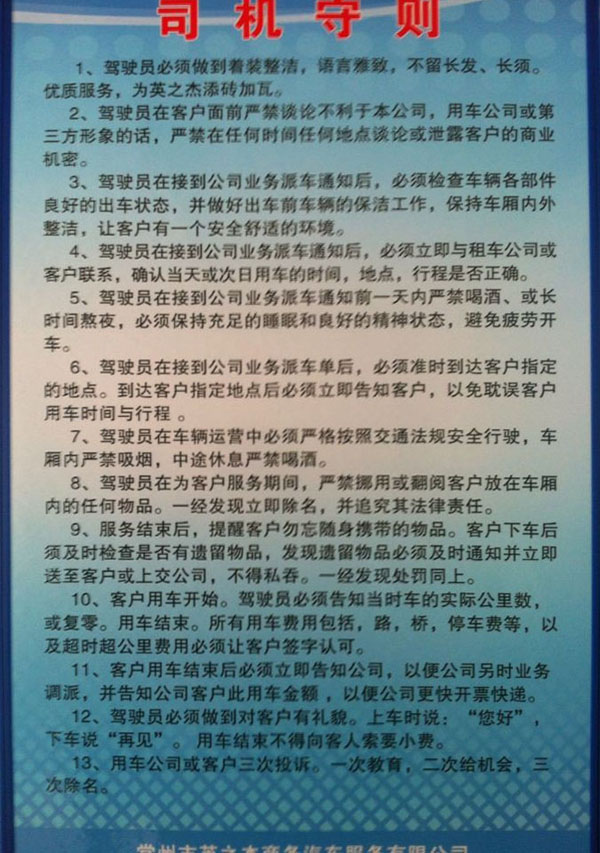 常州市英之杰商務(wù)汽車服務(wù)有限公司是一家專業(yè)從事企事業(yè)單位重要接待任務(wù)、企業(yè)高檔旅游等用車服務(wù)、以及中、小型高檔汽車的租賃業(yè)務(wù)。具有省交通廳批準(zhǔn)核發(fā)的客運(yùn)企業(yè)資質(zhì)證書。多年來,本公司從行業(yè)管理要求出發(fā),結(jié)合本公司的實際情況,堅持“親和、誠信、專業(yè)、便捷”的服務(wù)品牌內(nèi)涵,注重團(tuán)隊建設(shè)、車輛管理、安全管理和優(yōu)質(zhì)服務(wù)等,進(jìn)一步提升本公司在我市客運(yùn)行業(yè)中的良好形象。本公司著重在服務(wù)、安全管理上下功夫,從經(jīng)營管理、服務(wù)理念上找差距:從提高適應(yīng)市場的能力上做文章。扎扎實實地抓好各項管理工作,做強(qiáng)而不盲目求大,做憂而不盲目求全,一切以客戶需求為需求。目前公司與常武地區(qū)的多家大型企事業(yè)單位和上市公司(如國茂減速機(jī)集團(tuán)、國泰鑄造集團(tuán)、騰龍汽車零部件股份有限公司、石墨烯研究院、海斯町發(fā)動機(jī)零部件有限公司等企事業(yè)單位)建立了良好的租車合作關(guān)系