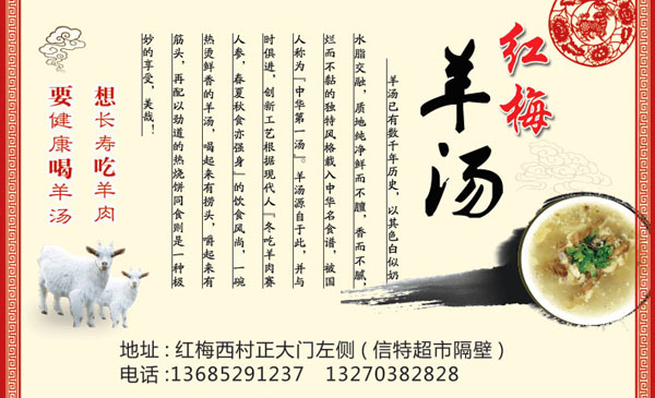 天寧區(qū)紅梅奧彩小吃店(紅梅羊湯店)成立十四年,特色是羊湯, 羊肉是中國人民食用的主要肉類之一.羊肉比其他肉類的肉質(zhì)要細(xì)嫩,而且膽固醇含星低。相對其他肉類而言,羊肉蛋白質(zhì)含量較多,脂肪含量較少。維生素B1、B2、B6以及鐵、鋅、硒的含量頗為豐富。此外,羊肉肉質(zhì)細(xì)嫩容易消化吸收.多吃羊肉有助于提高身體免疫力。 羊肉熱量比牛肉要高.中醫(yī)認(rèn)為,羊肉具有補(bǔ)精血,益虛勞.溫中健脾,補(bǔ)腎壯陽,養(yǎng)薛等功能,尤其適合老年人、體虛的人群食用。 羊肉的大部分脂肪都可看得見,很容易去除。羊腿部肉、肋骨和腰部肉比肩胛肉瘦。每100克烤羊腿中.含蛋白質(zhì)28克、脂肪7克、膽固醇100毫克.能提供的熱量是757.7千焦。 羊羔肉富含蛋白質(zhì)、鋅和維生素B族,其中煙酸、維生素B2和維生素B12的含量壟基圭富.羊羔肉中鎂、鉀和磷的含量也較高,并易于吸收。