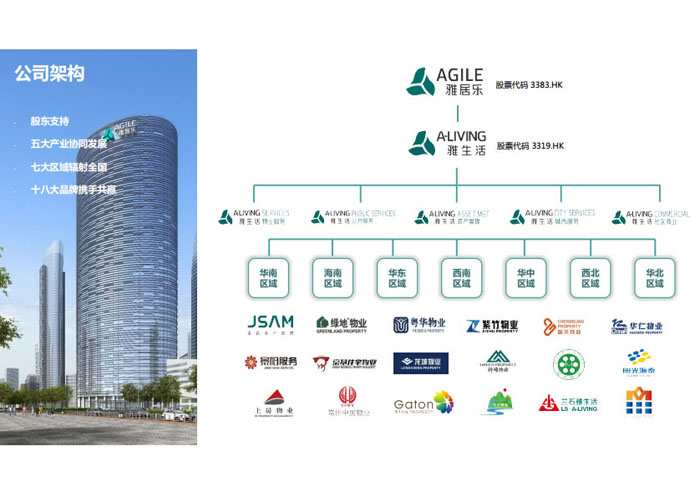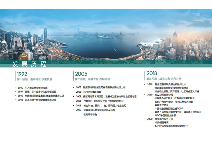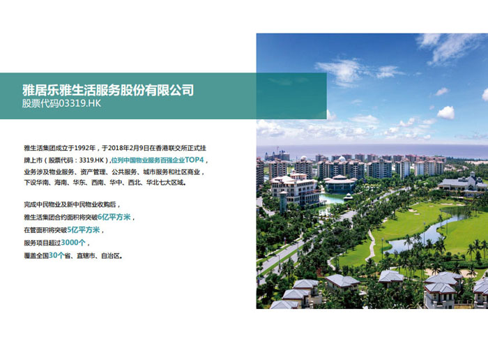 一、立足北上廣,面向全中國(guó),走向全世界 1992年,雅居樂(lè)物業(yè)開(kāi)篇中山,率先引入港式物業(yè)管理模式。1997年,依托雅居樂(lè)地產(chǎn)的崛起,連續(xù)接管中山多個(gè)項(xiàng)目,成為高端大盤(pán)物業(yè)管理的領(lǐng)跑者。1999年,雅居樂(lè)物業(yè)開(kāi)啟專業(yè)化發(fā)展模式,全面通過(guò)英國(guó)皇家BSI的ISO9000質(zhì)量管理體系認(rèn)證,2001年成為國(guó)家首批一級(jí)物業(yè)管理資質(zhì)企業(yè)。 2002年,隨著廣州雅居樂(lè)花園的盛大啟幕,雅居樂(lè)物業(yè)邁開(kāi)向廣州進(jìn)軍的步伐。為尋求更長(zhǎng)遠(yuǎn)的發(fā)展,雅居樂(lè)積極構(gòu)思上市藍(lán)圖,2005年在香港成功上市。在深耕珠三角城市群的同時(shí),2006年雅居樂(lè)物業(yè)揮師北上,正式開(kāi)啟全國(guó)部署戰(zhàn)略。2008年,接管海南清水灣項(xiàng)目,揭開(kāi)旅游地產(chǎn)物業(yè)管理的新篇章。 接下來(lái)近十年里,雅居樂(lè)物業(yè)始終保持著最年輕的成長(zhǎng)姿態(tài),依托“管理數(shù)字化、服務(wù)專業(yè)化、流程標(biāo)準(zhǔn)化和操作機(jī)械化”的發(fā)展戰(zhàn)略,雅居樂(lè)物業(yè)榮膺2018中國(guó)物業(yè)服務(wù)百?gòu)?qiáng)企業(yè)第11名,2018年中國(guó)物業(yè)服務(wù)百?gòu)?qiáng)企業(yè)成長(zhǎng)性第二名、2018年中國(guó)物業(yè)服務(wù)百?gòu)?qiáng)服務(wù)質(zhì)量領(lǐng)先企業(yè)、2018年中國(guó)物業(yè)服務(wù)百?gòu)?qiáng)滿意度領(lǐng)先企業(yè)、2018中國(guó)物業(yè)服務(wù)百?gòu)?qiáng)經(jīng)營(yíng)績(jī)效領(lǐng)先企業(yè)、旅游地產(chǎn)物業(yè)管理領(lǐng)先品牌、2018年中國(guó)辦公物業(yè)管理優(yōu)秀企業(yè)(綠地物業(yè))、2017中國(guó)物業(yè)管理企業(yè)品牌價(jià)值第12名、2017中國(guó)物業(yè)管理企業(yè)綜合實(shí)力第12名、中國(guó)藍(lán)籌物業(yè)企業(yè)、《旅游地產(chǎn)物業(yè)管理服務(wù)標(biāo)準(zhǔn)》(團(tuán)體標(biāo)準(zhǔn))起草工作等多項(xiàng)殊榮。 目前,雅生活集團(tuán)已形成廣州、中山、深圳、南京、上海、西安、成都、海南、云南、北京、鄭州、南寧、沈陽(yáng)、武漢、馬來(lái)西亞十五大城市公司全面發(fā)展的蓬勃態(tài)勢(shì)。截止2017年12月31日,雅生活集團(tuán)管理范圍覆蓋全國(guó)逾69座城市與地區(qū),服務(wù)類型涵蓋主流住宅、高端豪宅、旅游地產(chǎn)、商業(yè)、寫(xiě)字樓等多種業(yè)態(tài),合約總建筑面積為12610萬(wàn)平方米,擁有200多個(gè)項(xiàng)目,服務(wù)業(yè)主逾100萬(wàn)人。 2017年6月,雅生活集團(tuán)收購(gòu)綠地物業(yè)100%股權(quán),并與綠地集團(tuán)簽署戰(zhàn)略合作協(xié)議,8月,綠地集團(tuán)投資10億元獲得雅生活集團(tuán)20%股權(quán)。未來(lái),雅生活集團(tuán)將實(shí)施“雅居樂(lè)物業(yè)”與“綠地物業(yè)”雙品牌驅(qū)動(dòng)戰(zhàn)略,還將尋求在A股上市,力爭(zhēng)打造中國(guó)物業(yè)“A+H”第一股。