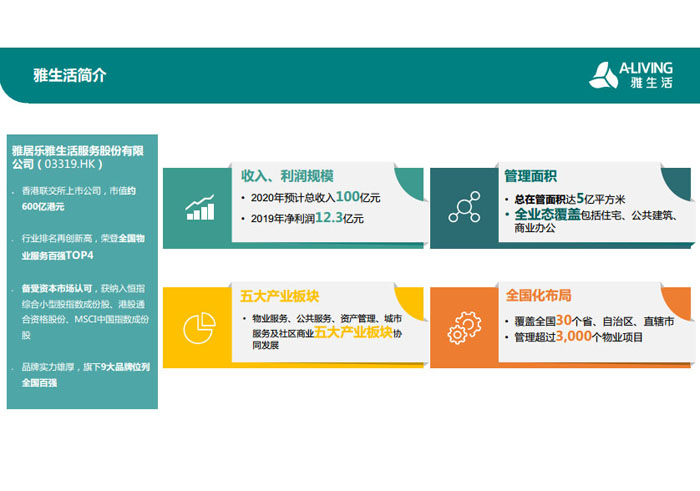 二、全面市場(chǎng)化運(yùn)作,加速增值服務(wù)發(fā)展 隨著越來(lái)越多物業(yè)服務(wù)企業(yè)走向資本市場(chǎng),物業(yè)行業(yè)之間的市場(chǎng)競(jìng)爭(zhēng)也愈演愈烈。行業(yè)集中度不斷提升,消費(fèi)者的需求日愈多元化,面對(duì)這樣的發(fā)展浪潮,雅生活集團(tuán)勇敢跳出原有只依靠承接自建物業(yè)的經(jīng)營(yíng)模式,開(kāi)始實(shí)施全面市場(chǎng)化運(yùn)作,通過(guò)市場(chǎng)拓展、兼并收購(gòu)尋求規(guī)模的迅速擴(kuò)大。 目前,雅生活集團(tuán)每年市場(chǎng)拓展目標(biāo)2000萬(wàn)平方米,承接業(yè)態(tài)除主流住宅物業(yè)以外,還包括商業(yè)、寫(xiě)字樓、旅游地產(chǎn)及酒店等非住宅物業(yè)管理業(yè)務(wù)。憑借26年的高品質(zhì)物業(yè)服務(wù)經(jīng)驗(yàn)和良好的品牌形象,雅生活集團(tuán)迅速在拓展市場(chǎng)成為后起之秀。2020年,雅生活集團(tuán)的市場(chǎng)拓展產(chǎn)值將達(dá)到20億。 在兼收并購(gòu)方面,雅生活集團(tuán)精準(zhǔn)出擊,成功收購(gòu)綠地物業(yè)100%股權(quán),這也成為物業(yè)管理行業(yè)的一大盛事。接下來(lái),雅生活集團(tuán)將繼續(xù)整合最優(yōu)質(zhì)資源,迅速做大做強(qiáng)。 在多種經(jīng)營(yíng)方面,雅生活集團(tuán)以業(yè)主需求為出發(fā)點(diǎn),對(duì)標(biāo)優(yōu)秀同行,因地制宜,創(chuàng)新發(fā)展,積極開(kāi)拓多種增值服務(wù),讓業(yè)主真正體會(huì)“驚喜+感動(dòng)”。