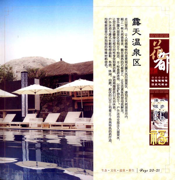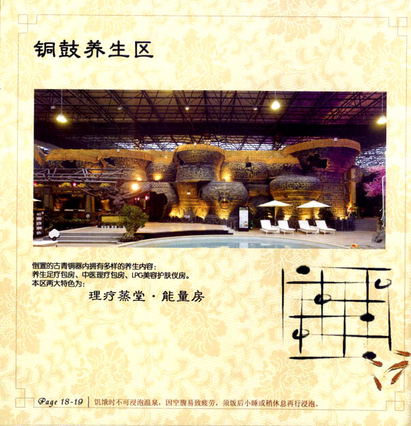 淹城花都溫泉水城孕育天地之精華,悅身、悅?cè)、悅心、悅神。置身其中泉水潺潺,霧氣繚繞、花瓣飄香,恍若仙境!稗渌略谑,弄花香滿衣”,花都溫泉的浪漫與溫潤(rùn)在這里完美展現(xiàn)。 花都溫泉水城包括洗浴區(qū)、戲水世界、露天溫泉、自助餐廳、生態(tài)房、別墅區(qū)、紅文化房、VIP區(qū)等多種功能區(qū)域,是集溫泉養(yǎng)生、休閑住宿、演藝會(huì)務(wù)為—體的休閑度假勝地,給賓客帶來(lái)江南小鎮(zhèn)的浪漫水城之旅。 古木新枝畔賓客對(duì)酒當(dāng)歌,溪泉石椅旁把茶品啜。 淹城-三勤生態(tài)酒店,這里是一處綠色生態(tài)的美食家園。此地鬼斧神工.奇水異石,和風(fēng)細(xì)雨林中穿過(guò),引百鳥(niǎo)朝來(lái)暮歌;這里集生態(tài)餐飲、演藝、中小型會(huì)務(wù)為一體,將現(xiàn)代裝飾風(fēng)格和古雅拙樸的自然裝修完美整合;這里聚集大江南北名廚,推出精致綠色美昧佳肴。來(lái)到這里,賓客可享田園至美之景,品舌尖至鮮之味,實(shí)乃人生一大樂(lè)事。