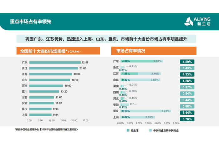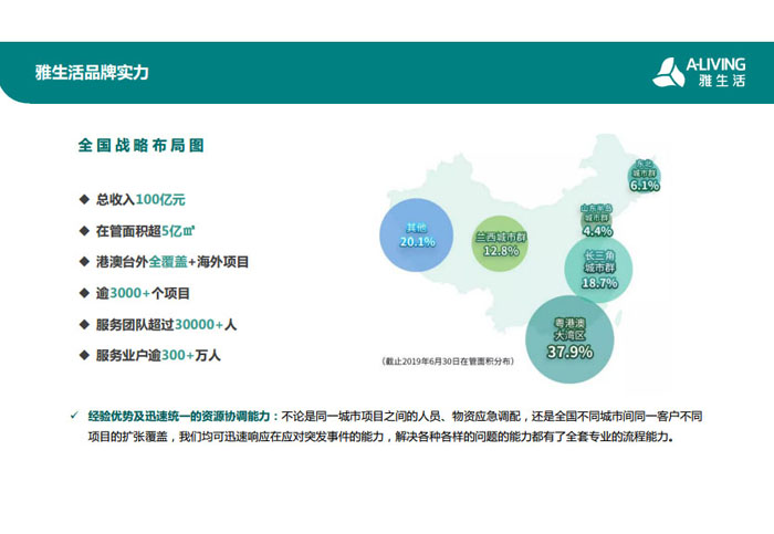一、立足北上廣,面向全中國,走向全世界 1992年,雅居樂物業(yè)開篇中山,率先引入港式物業(yè)管理模式。1997年,依托雅居樂地產(chǎn)的崛起,連續(xù)接管中山多個項目,成為高端大盤物業(yè)管理的領(lǐng)跑者。1999年,雅居樂物業(yè)開啟專業(yè)化發(fā)展模式,全面通過英國皇家BSI的ISO9000質(zhì)量管理體系認(rèn)證,2001年成為國家首批一級物業(yè)管理資質(zhì)企業(yè)。 2002年,隨著廣州雅居樂花園的盛大啟幕,雅居樂物業(yè)邁開向廣州進(jìn)軍的步伐。為尋求更長遠(yuǎn)的發(fā)展,雅居樂積極構(gòu)思上市藍(lán)圖,2005年在香港成功上市。在深耕珠三角城市群的同時,2006年雅居樂物業(yè)揮師北上,正式開啟全國部署戰(zhàn)略。2008年,接管海南清水灣項目,揭開旅游地產(chǎn)物業(yè)管理的新篇章。 接下來近十年里,雅居樂物業(yè)始終保持著最年輕的成長姿態(tài),依托“管理數(shù)字化、服務(wù)專業(yè)化、流程標(biāo)準(zhǔn)化和操作機(jī)械化”的發(fā)展戰(zhàn)略,雅居樂物業(yè)榮膺2018中國物業(yè)服務(wù)百強(qiáng)企業(yè)第11名,2018年中國物業(yè)服務(wù)百強(qiáng)企業(yè)成長性第二名、2018年中國物業(yè)服務(wù)百強(qiáng)服務(wù)質(zhì)量領(lǐng)先企業(yè)、2018年中國物業(yè)服務(wù)百強(qiáng)滿意度領(lǐng)先企業(yè)、2018中國物業(yè)服務(wù)百強(qiáng)經(jīng)營績效領(lǐng)先企業(yè)、旅游地產(chǎn)物業(yè)管理領(lǐng)先品牌、2018年中國辦公物業(yè)管理優(yōu)秀企業(yè)(綠地物業(yè))、2017中國物業(yè)管理企業(yè)品牌價值第12名、2017中國物業(yè)管理企業(yè)綜合實力第12名、中國藍(lán)籌物業(yè)企業(yè)、《旅游地產(chǎn)物業(yè)管理服務(wù)標(biāo)準(zhǔn)》(團(tuán)體標(biāo)準(zhǔn))起草工作等多項殊榮。 目前,雅生活集團(tuán)已形成廣州、中山、深圳、南京、上海、西安、成都、海南、云南、北京、鄭州、南寧、沈陽、武漢、馬來西亞十五大城市公司全面發(fā)展的蓬勃態(tài)勢。截止2017年12月31日,雅生活集團(tuán)管理范圍覆蓋全國逾69座城市與地區(qū),服務(wù)類型涵蓋主流住宅、高端豪宅、旅游地產(chǎn)、商業(yè)、寫字樓等多種業(yè)態(tài),合約總建筑面積為12610萬平方米,擁有200多個項目,服務(wù)業(yè)主逾100萬人。 2017年6月,雅生活集團(tuán)收購綠地物業(yè)100%股權(quán),并與綠地集團(tuán)簽署戰(zhàn)略合作協(xié)議,8月,綠地集團(tuán)投資10億元獲得雅生活集團(tuán)20%股權(quán)。未來,雅生活集團(tuán)將實施“雅居樂物業(yè)”與“綠地物業(yè)”雙品牌驅(qū)動戰(zhàn)略,還將尋求在A股上市,力爭打造中國物業(yè)“A+H”第一股。