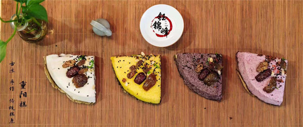 腳踏糕本名“年糕”,按常州周邊地區(qū)的風(fēng)俗習(xí)慣,在春季前夕,各家各戶都要蒸年糕,吃年糕!案狻敝C音“高”,過年吃年糕被賜予“年年高”,一年高一年,鋒吉祥之意,表達(dá)這人們對(duì)未來美好生活的憧憬和良好的祝愿。今天小編要帶大家的就是一家至今保持著傳統(tǒng)手工制作的鈺鋒糕點(diǎn)坊。 鈺鋒糕點(diǎn)坊位于常州鄭陸鎮(zhèn)三皇廟范家莊,一個(gè)比較偏僻的村莊,雖然這家作坊不大,但香糯絲滑,軟糯適中,韌勁十足的腳踏糕吸引了無數(shù)的食客。制作一條腳踏糕要從淘米,浸泡,碾粉,鋪粉,一層一層的鋪下去,需要無數(shù)道制作工序,這些都是店主孫煥公公老周,憑著幾十年的經(jīng)驗(yàn),加上店主孫煥從不馬虎的決心! 這“腳踏”也并非赤腳上陣,而是把蒸好的糕倒入早以準(zhǔn)備好的框子里,用布包裹好,上面再用薄膜包好,再蓋上布,再換上專門腳踏的布鞋,踩的時(shí)候要?jiǎng)蚍Q,左右腳要配合好,不然糕會(huì)高高低低,不平整,最后再拿蠟燭線拆成一條小長(zhǎng)條,再拿帶包裝好,如此又香又糯的腳踏糕就大功告成了。 店主孫煥為了讓更多的人認(rèn)識(shí)和了解常州腳踏糕的傳統(tǒng)文化和美食,她在傳統(tǒng)工藝中增加了適合現(xiàn)代文化的多種口味,她在糕里加入南瓜,紫薯,老紅糖,大麥汁,血糯米,核桃,葡萄干,紅棗等食材,做出五顏六色,純天然的口味,深受食客們的喜愛,不管是送人還是自己吃都非常新穎。 (重陽糕)重陽糕的由來,九九重陽,九是陽數(shù),也是陽數(shù)中最大的數(shù),九月初九,兩九相重,為之重陽,古人有重陽登高的習(xí)俗。高于糕同意,寓意人活九十九,生活步步高,秋景勝春光,夕陽無限好。夕陽紅成了老人對(duì)自己美好的祝愿和希望,所以從某種意義上來講它“祝壽糕”“長(zhǎng)壽糕”重陽糕在常州地區(qū)是家喻戶曉的,下面小編帶你去一家至今保持傳統(tǒng)手工制作的鈺鋒糕點(diǎn)坊看一下吧。鈺鋒糕點(diǎn)坊位于常州市天寧區(qū)鄭陸鎮(zhèn)三皇廟范家莊,偏僻的小村莊,雖然有點(diǎn)偏僻,但是每到重陽節(jié)到來,每天還是有很多食客來訂購和購買店主孫煥做的多種口味的重陽糕。要想做出松軟香糯的重陽糕,原材料和糯米和梗米的配比也很重要,調(diào)整好比例開始淘米,浸泡,釓粉,放入糖攪拌,篩粉,糕底部放上荷葉,中間的餡心都是孫煥自己熬制,口感,香糯松軟,店主孫煥為了吸引更多現(xiàn)代年輕人,她在粉里加入南瓜,紫薯,紅糖,血糯等,色彩搭配很出跳,吸引來了很多食客,孫煥2019年開始自愿捐贈(zèng)重陽糕給敬老院,她說這樣的公益活動(dòng)自己很喜歡,雖然金額不大,缺表達(dá)了她的一份心意,并稱這樣的公益活動(dòng)她每年都會(huì)做。