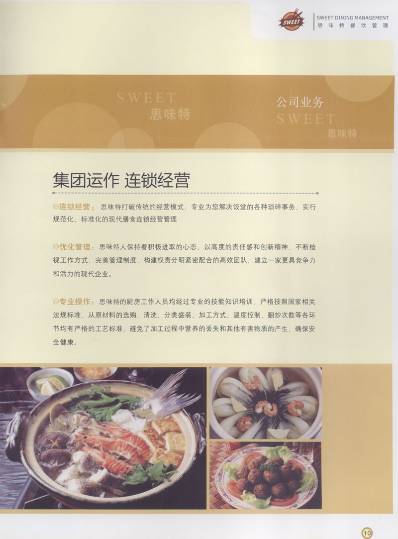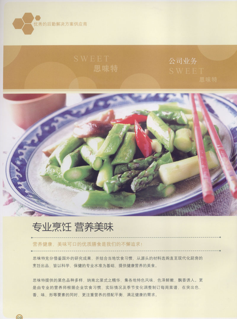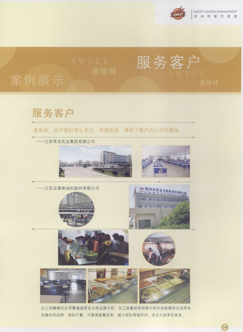 常州市思味特餐飲有限公司是一家專業(yè)從事企事業(yè)后勤服務(wù)的有限責(zé)任公司,公司從承包食堂起步,逐漸發(fā)展為經(jīng)營團膳承包、營養(yǎng)送餐、生活區(qū)管理、連鎖餐廳的綜合型企業(yè)。2008年公司斥資100萬元,在常州興建了可以同時提供3000餐膳食的中央廚房,重點打造“和美客”后勤服務(wù)品牌,全力為企事業(yè)單位解決后勤后顧之憂。 到目前為止,我們合作成功的企事業(yè)單位超過50多家,服務(wù)人數(shù)突破15萬,合作單位包括國家機關(guān)、國有企業(yè)、三資企業(yè)、民營企業(yè)、學(xué)校、醫(yī)院等,其中不乏國際知名品牌公司。 和美客愿為更多的國內(nèi)外企事業(yè)單位及機關(guān)團體分憂解難,從廚房設(shè)計、菜品配送、團膳承包、到生活區(qū)管理等提供全方位的服務(wù)。
