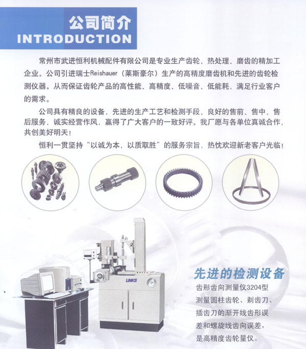 常州市武進恒利機械配件有限公司是專業(yè)生產(chǎn)齒輪、熱處理、磨齒的精加工企業(yè)。公司引進瑞士Reishauer(菜斯豪爾)生產(chǎn)的高精度磨齒機和先進的齒輪檢測儀器。從而保證齒輪產(chǎn)品的高-性能、高精度、低噪音、低能耗,滿足行業(yè)客戶的需求。 公司具有精良的設備,先進的生產(chǎn)工藝和檢測手段、良好的售前、售中、售后服務,誠實經(jīng)營作風,贏得了廣大客戶的一致好評。我廠愿與各單位真誠合作,共創(chuàng)美好明天! 恒利一貫堅持“以誠為本,以質(zhì)取勝”的服務宗旨,熱忱歡迎新老客戶光臨!