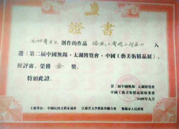毛懷青,江蘇常州市武進(jìn)人。 中國工藝美術(shù)學(xué)會會員,常州市中國烙畫研究會副會長,常州市文博鑒賞協(xié)會理事,非物質(zhì)文化遺產(chǎn)烙畫傳承人。高級工藝美術(shù)師。 年輕時(shí)學(xué)習(xí)國畫、油畫中年蔓現(xiàn)掌州咯畫源遠(yuǎn)流長、歷史悠久,有著其它美術(shù)門類不具備的藝術(shù)風(fēng)格與特色?芍^是工藝美術(shù)中的一朵十分亮麗的藝術(shù)奇葩,是我民族先人給我們留下的一份不可多得十分珍貴的一份文化遺產(chǎn)。為弘揚(yáng)與發(fā)展這份優(yōu)秀文化遺產(chǎn),我從此下定決心研究烙畫,愿付出一份力量為振興烙畫事業(yè)做出貢獻(xiàn)。至今已潛心研究幾十年,取得了可喜的成績,被業(yè)界公認(rèn),社會關(guān)注與認(rèn)可。有“江南烙畫第一筆”之美譽(yù)。 近年來,創(chuàng)作的烙畫作品分別獲得過全國、省市級的金、銀、銅獎(jiǎng)多次。中央電視臺曾兩次播放過本人的烙畫作品,江蘇電視臺、常州電視臺也曾多次播放過本人的作品與烙畫藝術(shù)生涯,揚(yáng)子晚報(bào)、常州日報(bào)、常州晚報(bào)也曾多次報(bào)導(dǎo)過本人的烙畫作品,出版物有三種版本都能查閱到介紹本的烙畫從藝生涯與藝術(shù)業(yè)績。
