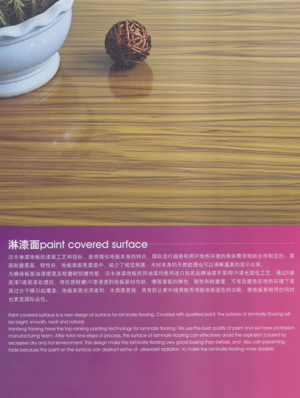 常州漢豐裝飾材料有限公司是一家涉及強(qiáng)化地板制造、屏風(fēng)鋁材生產(chǎn)、進(jìn)出口貿(mào)易的大型公司。2001年公司投入重資.全面引進(jìn)世界頂級一體化自動流水生產(chǎn)線和具有國際先進(jìn)水準(zhǔn)的德國權(quán)威木地板生產(chǎn)技術(shù),興建強(qiáng)化地板生產(chǎn)基地。多年以來.一直不斷加強(qiáng)生產(chǎn)設(shè)備、廠房基礎(chǔ)投入,目前公司年生產(chǎn)強(qiáng)化地板能力已經(jīng)達(dá)到了500萬平方米,步入國內(nèi)一流行列,具備了雄厚的國際競爭力。 漢豐地板以奉獻(xiàn)生活中最完美的地板為發(fā)展目標(biāo),時(shí)尚流行的設(shè)計(jì)風(fēng)格和多樣化的產(chǎn)品類型,贏得了市場的廣泛贊譽(yù)和肯定。產(chǎn)品嚴(yán)格按照歐洲標(biāo)準(zhǔn)檢測強(qiáng)化木地板的各項(xiàng)性能指標(biāo).達(dá)到百分百的國際技術(shù)標(biāo)準(zhǔn),確保了每一塊地板都有著上乘品質(zhì),是綠色環(huán)保的好地板。并先后通過了Isc)9001國際質(zhì)量管理體系認(rèn)證,IS014001國際環(huán)境管理體系認(rèn)證.中國環(huán)境標(biāo)志產(chǎn)品認(rèn)證,深得用戶的一致好評,是寫字樓、商場、大型超市、學(xué)校、建筑樓宇、娛樂場所、家用私宅等鋪裝的首選地板。