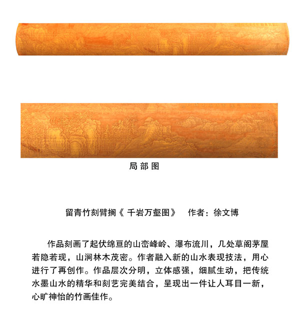 徐博(藝名文博),1973年生,江蘇武進(jìn)人,江蘇省省名人,高級(jí)工藝美術(shù)師,常州市留青竹刻非遺傳承人,常州工藝美術(shù)家協(xié)會(huì)理事,被譽(yù)為當(dāng)今中國(guó)最具創(chuàng)新意識(shí)的新銳竹刻家代表,多次獲得國(guó)家工藝美術(shù)大獎(jiǎng)?釔(ài)留青竹刻的徐文博賞竹為樂(lè),以竹詠志,借竹抒懷,悉心探索留青竹刻的藝術(shù)表現(xiàn)。在中國(guó)工藝美術(shù)大師蕭劍波的精心指導(dǎo)下,開(kāi)創(chuàng)留青水墨山水之技法,更好的體現(xiàn)了竹刻淡雅清秀的藝術(shù)風(fēng)格,并不斷汲取書(shū)畫(huà)、攝影、雕塑等藝術(shù)精華,不斷滋養(yǎng)藝術(shù)情趣,提升擴(kuò)展胸襟人格的同時(shí)也逐步形成了其形神兼?zhèn)洌搶?shí)相生,氣韻生動(dòng)的藝術(shù)特點(diǎn),作品為眾多的國(guó)內(nèi)外收藏家珍藏。