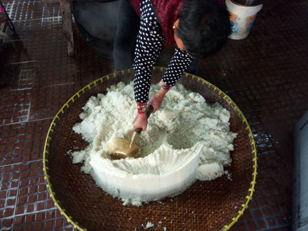 第三步:拌入酒曲,這時候才發(fā)現(xiàn)了“木桶”的神奇之處:一頭空,另一頭也是空,只不過用鋼筋做了個柵欄。之前蒸米飯,老徐是墊上了蒲草,一方面讓糯米飯更易熟,另一方面也增加了糯米飯的清香氣息。把糯米飯倒入蠶匾中,邊翻動糯米飯邊撒上酒曲,使酒曲與糯米飯充分拌勻。