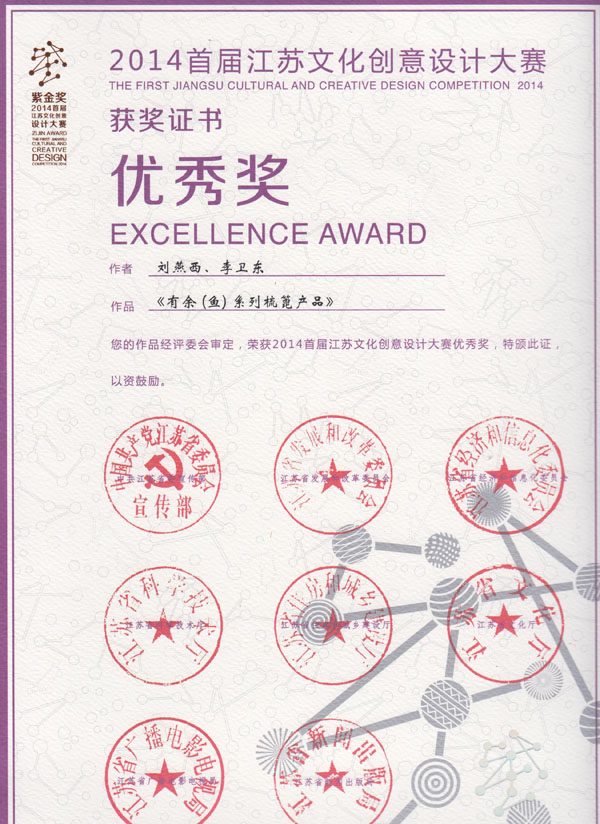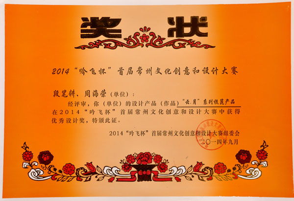 公司榮譽介紹: “2009年常州市旅游商品創(chuàng)新設(shè)計大賽”,“覽盡千荷”綠檀雕刻梳榮獲三等獎; “2011年常州市旅游商品創(chuàng)新設(shè)計大賽”,“彩印工藝梳-我們的年代(80)”榮獲二等獎。 “2011年中國包裝創(chuàng)意設(shè)計大賽“,虞美人彩印梳篦系列包裝獲得一等獎; “2011年中國包裝創(chuàng)意設(shè)計大賽”,虞美人筷子系列包裝獲得三等獎; “2011創(chuàng)意中國.第五屆設(shè)計藝術(shù)大獎賽”,虞美人系列包裝獲得三等獎; “2011首屆中國(無錫)國際文化藝術(shù)博覽會”,漆藝對梳《喜玫瑰》獲得“藝博杯“銅獎。 “第十三屆中國工藝美術(shù)大師作品暨國際藝術(shù)精品博覽會”, 漆藝梳《報喜鳥》榮獲2012“儒士儒家•百花杯”中國工藝美術(shù)精品獎優(yōu)秀獎 “第十三屆中國工藝美術(shù)大師作品暨國際藝術(shù)精品博覽會”, 虞美人《渾然天成》榮獲2012“儒士儒家•百花杯”中國工藝美術(shù)精品獎金獎 “2012江蘇省工藝美術(shù)精品大獎賽”,虞美人《S型梳》喜獲“藝博杯”銀獎 “第十四屆中國工藝美術(shù)大師作品暨國際藝術(shù)精品博覽會”, 虞美人工藝梳《新型十二星座梳》榮獲2013“國信•百花杯”中國工藝美術(shù)精品獎優(yōu)秀獎 “2013【藝博杯】江蘇省工藝美術(shù)精品大獎賽”,虞美人《萬事如意系列》喜獲“藝博杯”銀獎 “2013江蘇省工藝美術(shù)新人新作成果展作品大獎賽”,虞美人《壺(福)的藝術(shù)》喜獲“藝博杯”入圍獎 2013年度江蘇省“蘇商領(lǐng)袖峰會”,常州市卓尚飾品有限公司榮獲最具成長性企業(yè)獎 常州市卓尚飾品(虞美人)有限公司總經(jīng)理李衛(wèi)東榮獲“常州創(chuàng)意產(chǎn)業(yè)協(xié)會2013年底慈善獎榮譽” 常州市卓尚飾品有限公司榮獲薛家鎮(zhèn)人民政府2013年度“創(chuàng)新創(chuàng)優(yōu)”獎 常州市卓尚飾品有限公司榮獲薛家鎮(zhèn)人民政府2013年度“銷售業(yè)績”獎 2014中國(深圳)國際文化產(chǎn)業(yè)博覽交易會,劉燕西、李衛(wèi)東、段筆耕<十二星座系列>獲得“中國工藝美術(shù)文化創(chuàng)意獎”銀獎 2014中國(深圳)國際文化產(chǎn)業(yè)博覽交易會,徐德鴻、李衛(wèi)東、段筆耕《漆彩人生系列》獲得“中國工藝美術(shù)文化創(chuàng)意獎”銅獎 文化創(chuàng)意大獎賽“紫金獎” ,有余(魚)系列梳篦產(chǎn)品獲得了優(yōu)秀獎 2014吟飛杯首屆常州文化創(chuàng)意和設(shè)計大賽,虞美人有余(魚)系列梳篦產(chǎn)品榮獲優(yōu)秀設(shè)計獎 2014吟飛杯首屆常州文化創(chuàng)意和設(shè)計大賽,虞美人“云,月”系列梳篦產(chǎn)品榮獲優(yōu)秀設(shè)計獎 2014藝博杯江蘇省工藝美術(shù)精品大獎賽,虞美人《梳篦:酒醉的探戈》喜獲銀獎 2014“中國原創(chuàng)•百花杯”中國工藝美術(shù)精品大獎賽,虞美人《梳篦-江南風(fēng)韻系列》喜獲銀獎 常州市卓尚飾品有限公司獲“2014年常州市電子商務(wù)協(xié)會2014年度優(yōu)秀會員單位” 2014“虞美人”成為常州市知名商標(biāo)。