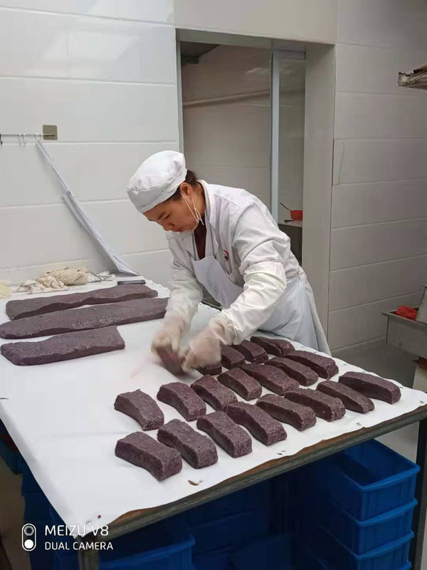 腳踏糕本名“年糕”,按常州周邊地區(qū)的風(fēng)俗習(xí)慣,在春季前夕,各家各戶都要蒸年糕,吃年糕!案狻敝C音“高”,過(guò)年吃年糕被賜予“年年高”,一年高一年,鋒吉祥之意,表達(dá)這人們對(duì)未來(lái)美好生活的憧憬和良好的祝愿。今天小編要帶大家的就是一家至今保持著傳統(tǒng)手工制作的鈺鋒糕點(diǎn)坊。 鈺鋒糕點(diǎn)坊位于常州鄭陸鎮(zhèn)三皇廟范家莊,一個(gè)比較偏僻的村莊,雖然這家作坊不大,但香糯絲滑,軟糯適中,韌勁十足的腳踏糕吸引了無(wú)數(shù)的食客。制作一條腳踏糕要從淘米,浸泡,碾粉,鋪粉,一層一層的鋪下去,需要無(wú)數(shù)道制作工序,這些都是店主孫煥公公老周,憑著幾十年的經(jīng)驗(yàn),加上店主孫煥從不馬虎的決心! 這“腳踏”也并非赤腳上陣,而是把蒸好的糕倒入早以準(zhǔn)備好的框子里,用布包裹好,上面再用薄膜包好,再蓋上布,再換上專門腳踏的布鞋,踩的時(shí)候要?jiǎng)蚍Q,左右腳要配合好,不然糕會(huì)高高低低,不平整,最后再拿蠟燭線拆成一條小長(zhǎng)條,再拿帶包裝好,如此又香又糯的腳踏糕就大功告成了。 店主孫煥為了讓更多的人認(rèn)識(shí)和了解常州腳踏糕的傳統(tǒng)文化和美食,她在傳統(tǒng)工藝中增加了適合現(xiàn)代文化的多種口味,她在糕里加入南瓜,紫薯,老紅糖,大麥汁,血糯米,核桃,葡萄干,紅棗等食材,做出五顏六色,純天然的口味,深受食客們的喜愛,不管是送人還是自己吃都非常新穎。 (重陽(yáng)糕)重陽(yáng)糕的由來(lái),九九重陽(yáng),九是陽(yáng)數(shù),也是陽(yáng)數(shù)中最大的數(shù),九月初九,兩九相重,為之重陽(yáng),古人有重陽(yáng)登高的習(xí)俗。高于糕同意,寓意人活九十九,生活步步高,秋景勝春光,夕陽(yáng)無(wú)限好。夕陽(yáng)紅成了老人對(duì)自己美好的祝愿和希望,所以從某種意義上來(lái)講它“祝壽糕”“長(zhǎng)壽糕”重陽(yáng)糕在常州地區(qū)是家喻戶曉的,下面小編帶你去一家至今保持傳統(tǒng)手工制作的鈺鋒糕點(diǎn)坊看一下吧。鈺鋒糕點(diǎn)坊位于常州市天寧區(qū)鄭陸鎮(zhèn)三皇廟范家莊,偏僻的小村莊,雖然有點(diǎn)偏僻,但是每到重陽(yáng)節(jié)到來(lái),每天還是有很多食客來(lái)訂購(gòu)和購(gòu)買店主孫煥做的多種口味的重陽(yáng)糕。要想做出松軟香糯的重陽(yáng)糕,原材料和糯米和梗米的配比也很重要,調(diào)整好比例開始淘米,浸泡,釓粉,放入糖攪拌,篩粉,糕底部放上荷葉,中間的餡心都是孫煥自己熬制,口感,香糯松軟,店主孫煥為了吸引更多現(xiàn)代年輕人,她在粉里加入南瓜,紫薯,紅糖,血糯等,色彩搭配很出跳,吸引來(lái)了很多食客,孫煥2019年開始自愿捐贈(zèng)重陽(yáng)糕給敬老院,她說(shuō)這樣的公益活動(dòng)自己很喜歡,雖然金額不大,缺表達(dá)了她的一份心意,并稱這樣的公益活動(dòng)她每年都會(huì)做。