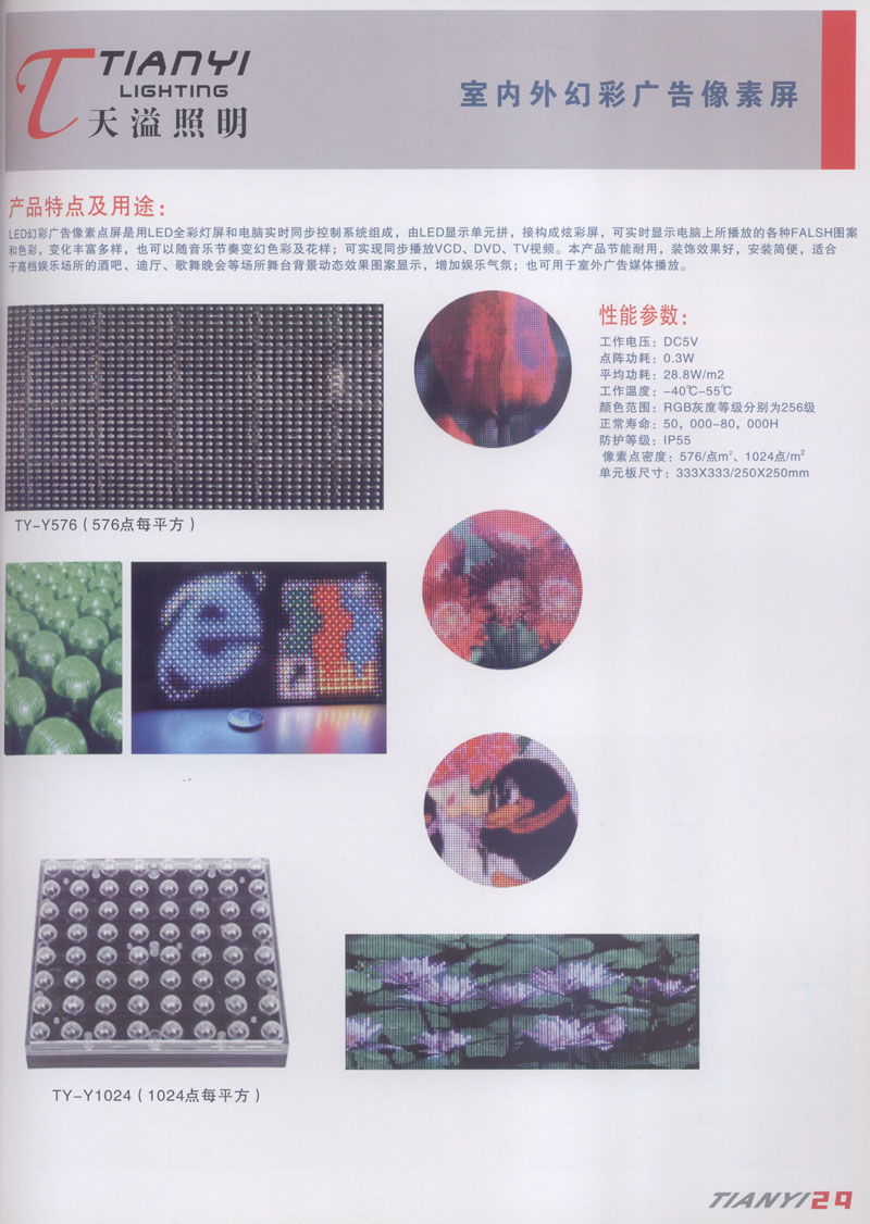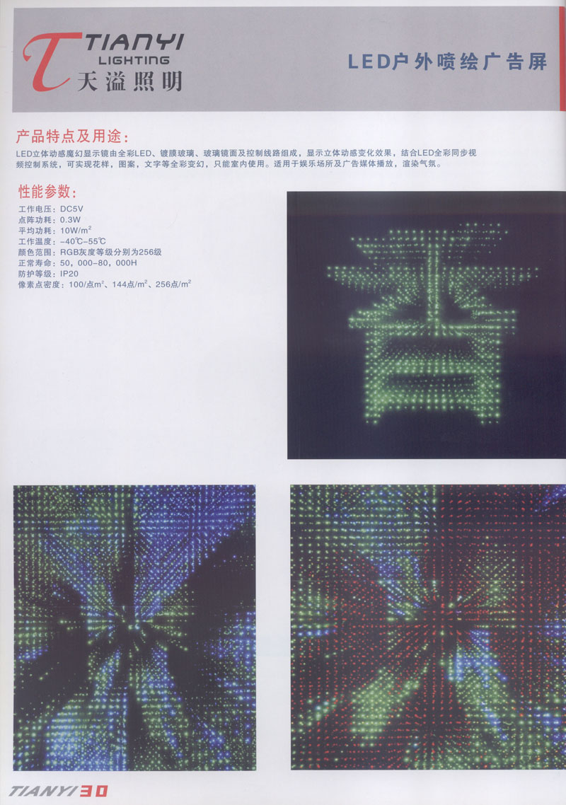 天溢照明是中國(guó)領(lǐng)先的專業(yè)從事LED廣告照明裝飾燈具設(shè)計(jì)、系統(tǒng)開發(fā)、燈具制造、工程服務(wù)一體的專業(yè)型公司,本公司產(chǎn)品已廣泛應(yīng)用于全國(guó)大多數(shù)城市夜景亮化景觀照明、酒店休閑娛樂夜場(chǎng)夢(mèng)幻燈光、戶內(nèi)外廣告宣傳、建筑及室內(nèi)照明以及家居裝飾等場(chǎng)合。